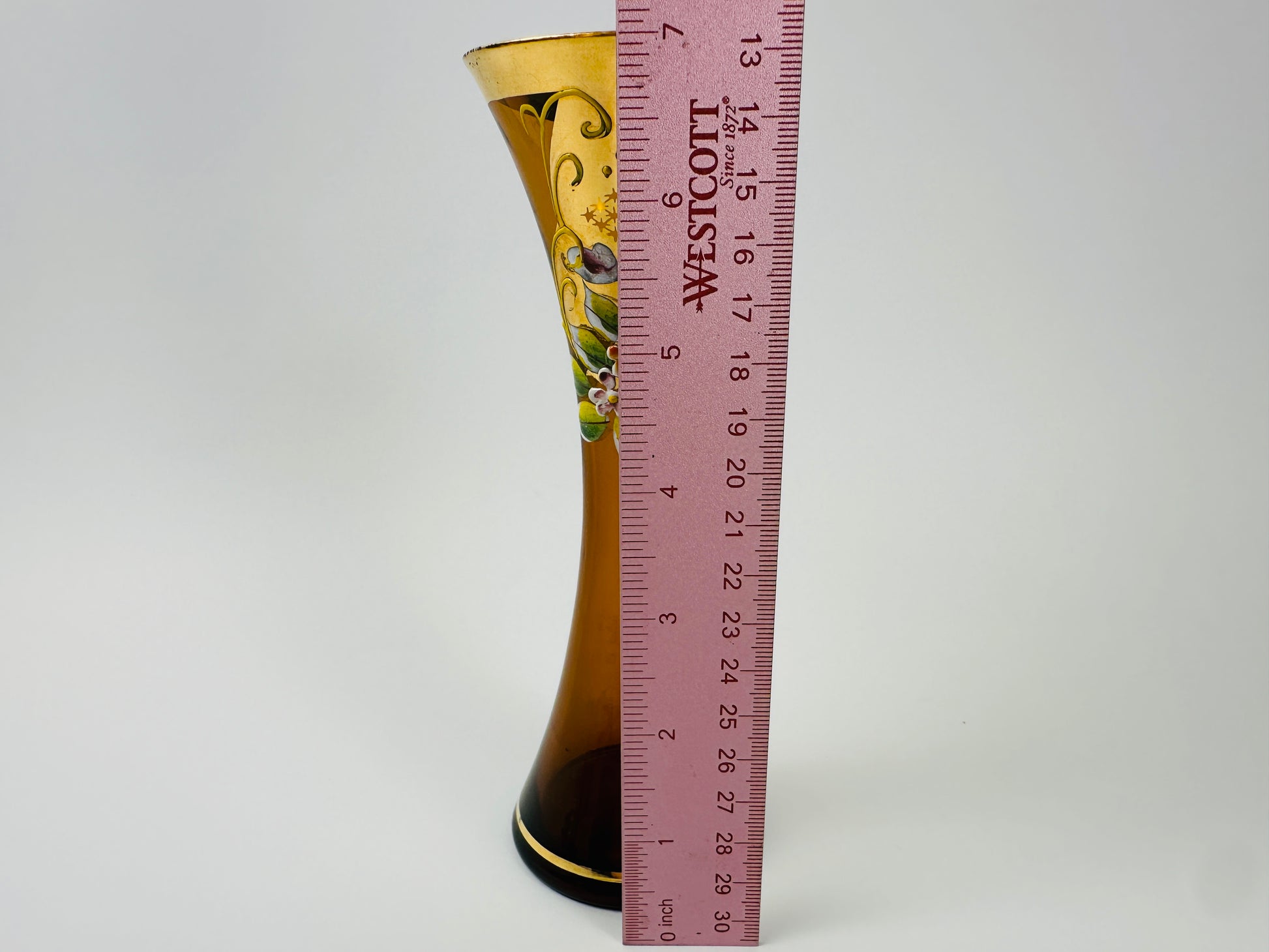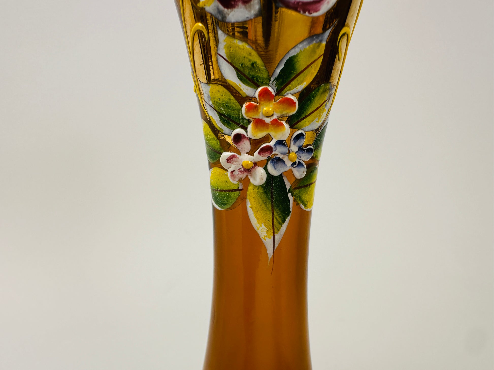 Amber glass hand-painted Bohemian bud vase with applied raised flowers. As an alternative to expensive florist flowers in mass-produced, throw-away vases, select a few favorite blooms for a beautiful vintage vase as a memorable and reusable gift.
