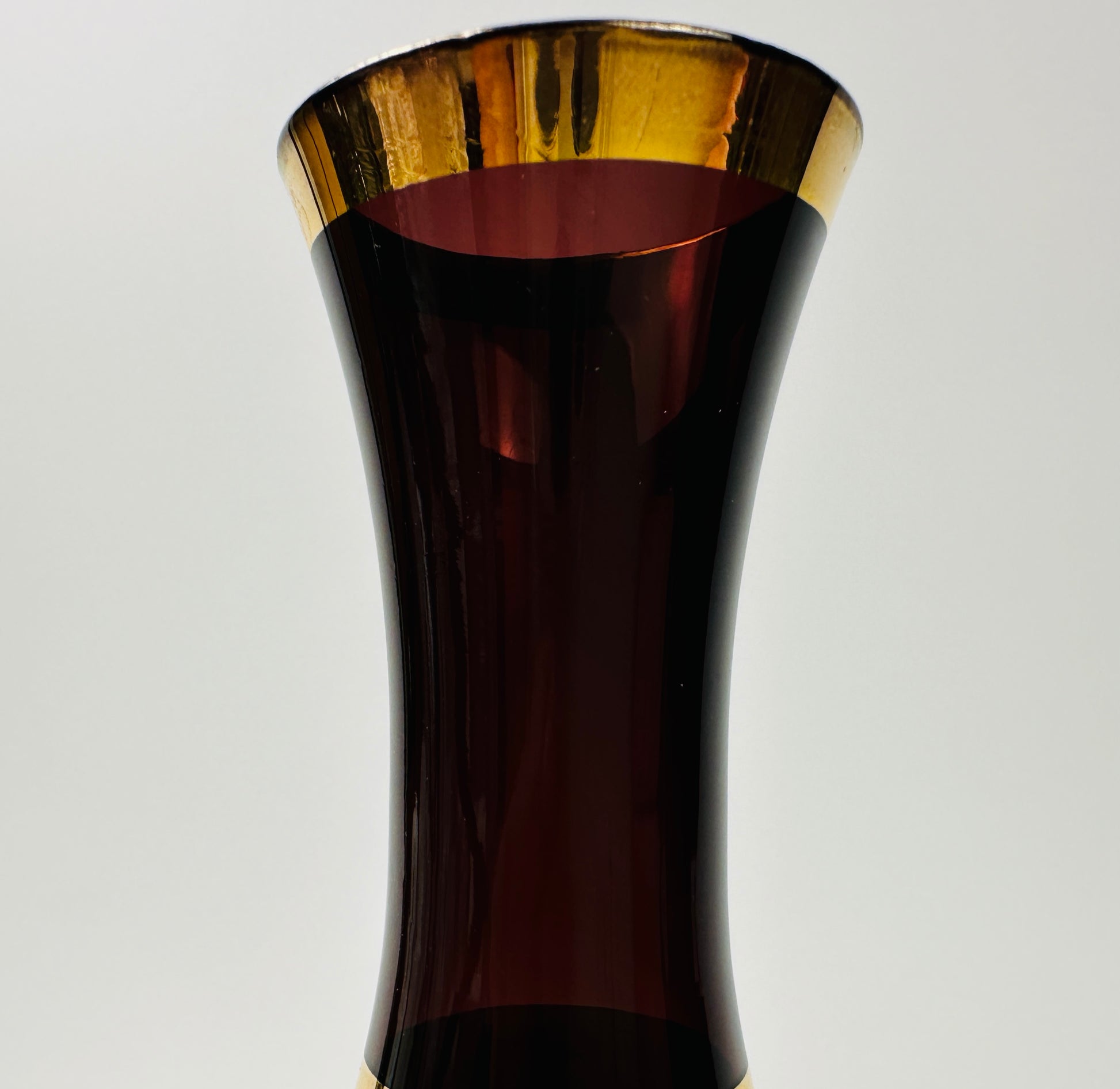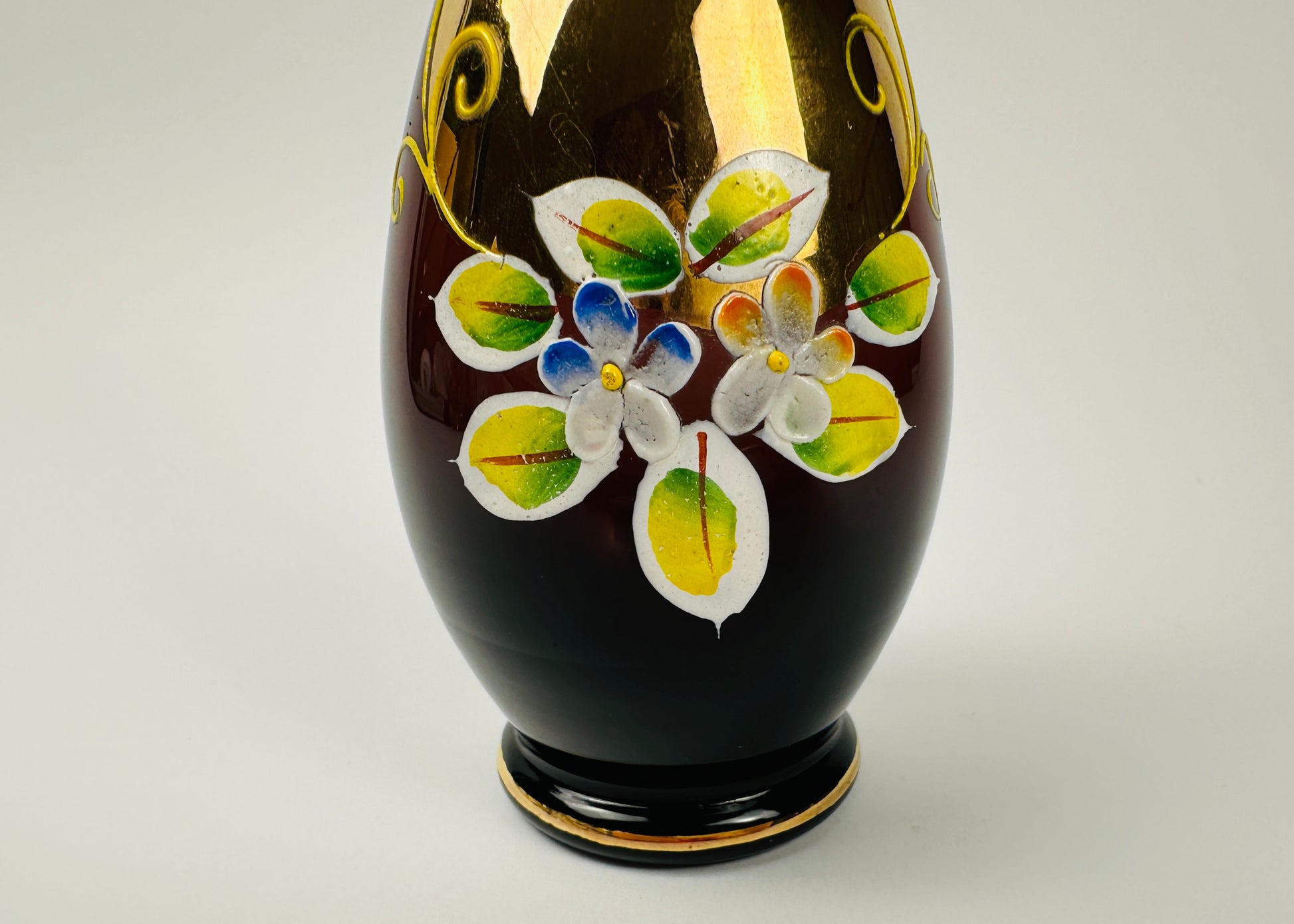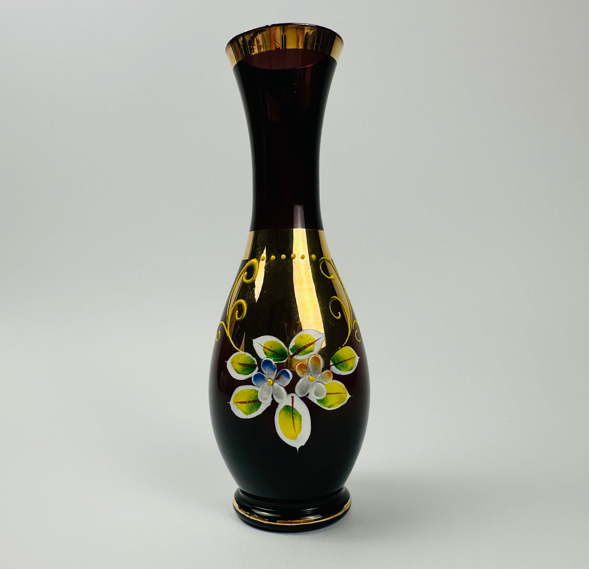 Plum/purple glass Bohemian bud vase hand-painted with gilded accents and applied raised flowers. As an alternative to expensive florist flowers in mass-produced, throw-away vases, select a few favorite blooms for a beautiful vintage vase as a memorable and reusable gift.