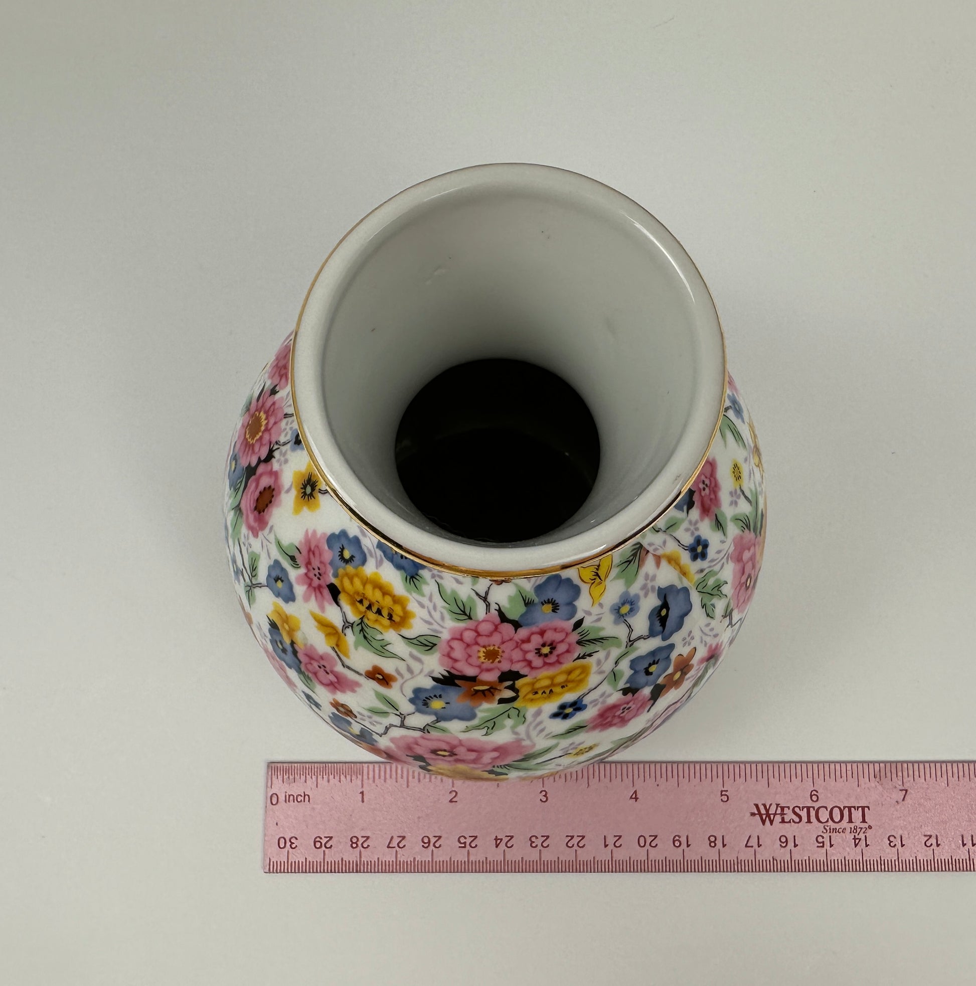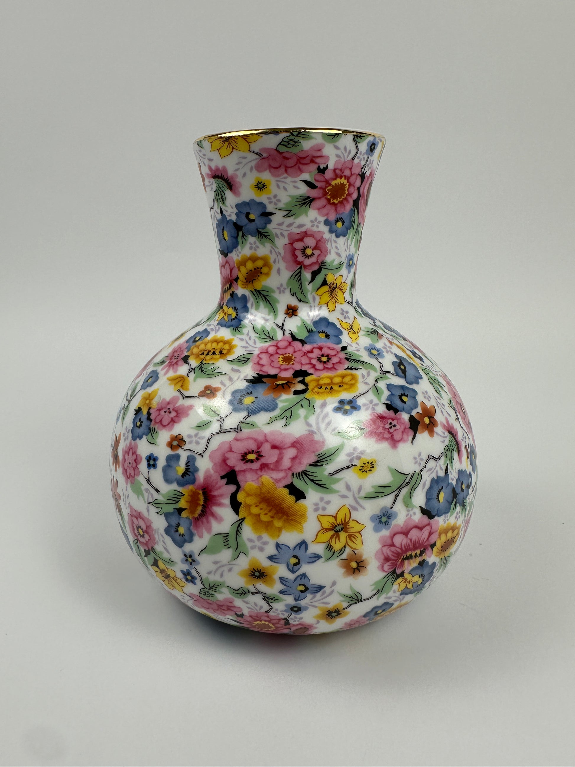 Chintz floral multi-color pattern on a white background – a very vintage and feminine vase. As an alternative to expensive florist flowers in mass-produced, throw-away vases, select a few favorite blooms for a beautiful decorative vase as a memorable and reusable gift.