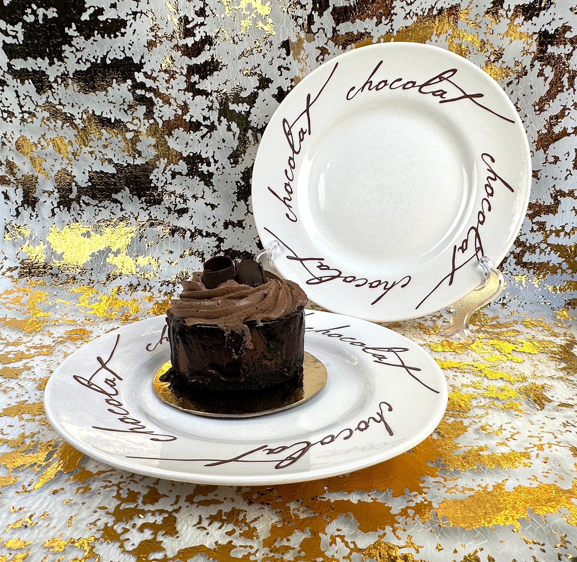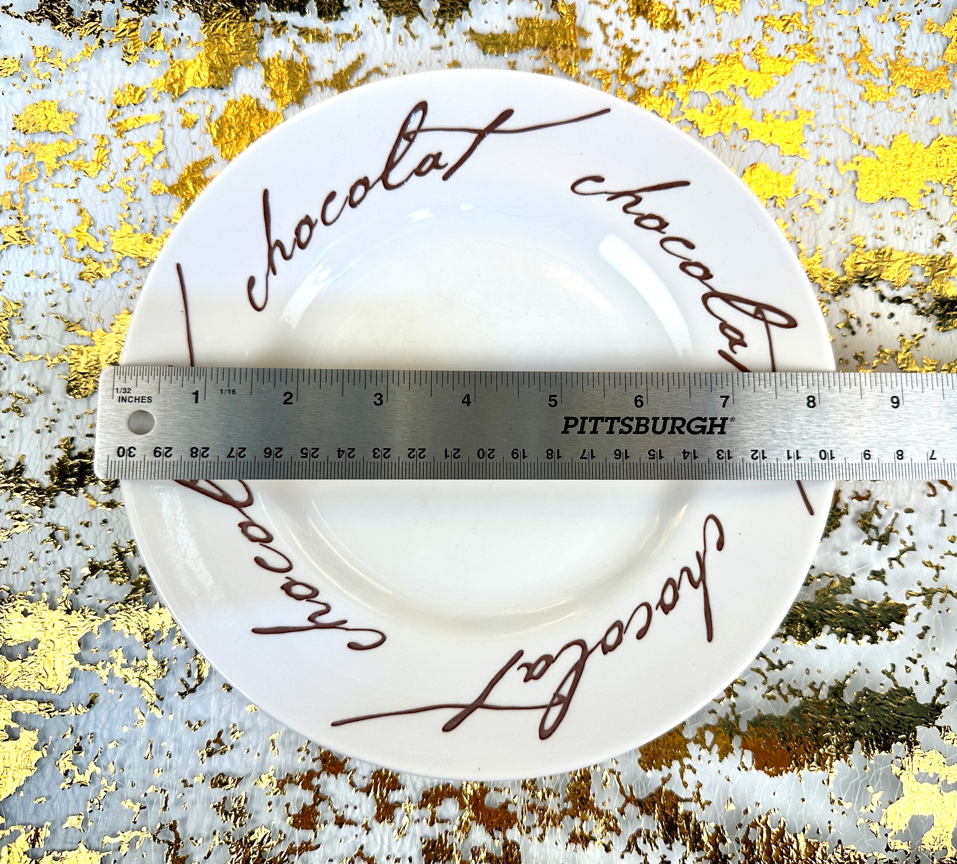 Set of ten “chocolat” script rim design desert plates. Dimensions shown in photos are part of the description. All BHDLV product offerings are previously owned and condition will be good condition consistent with previous use unless otherwise noted.