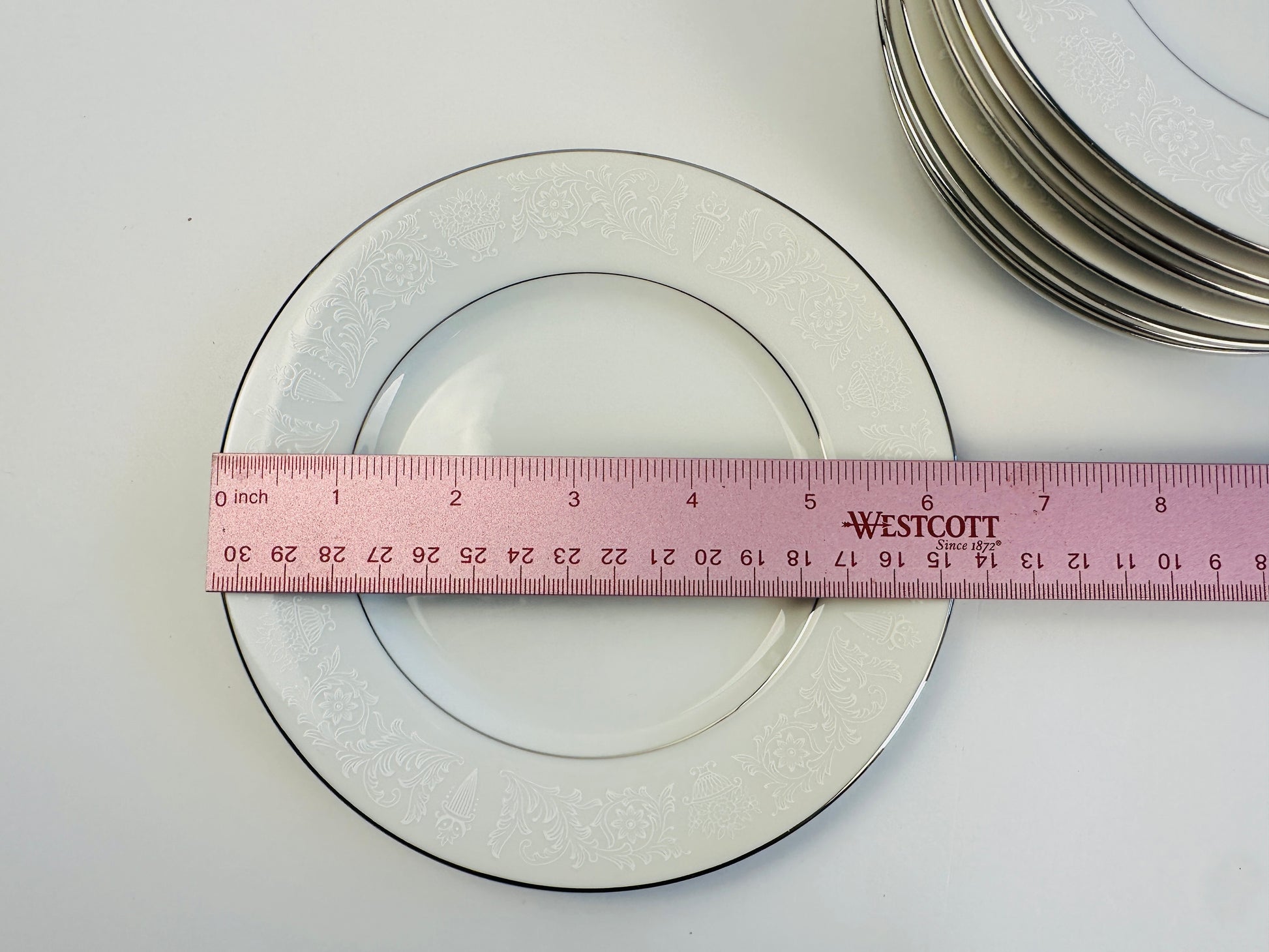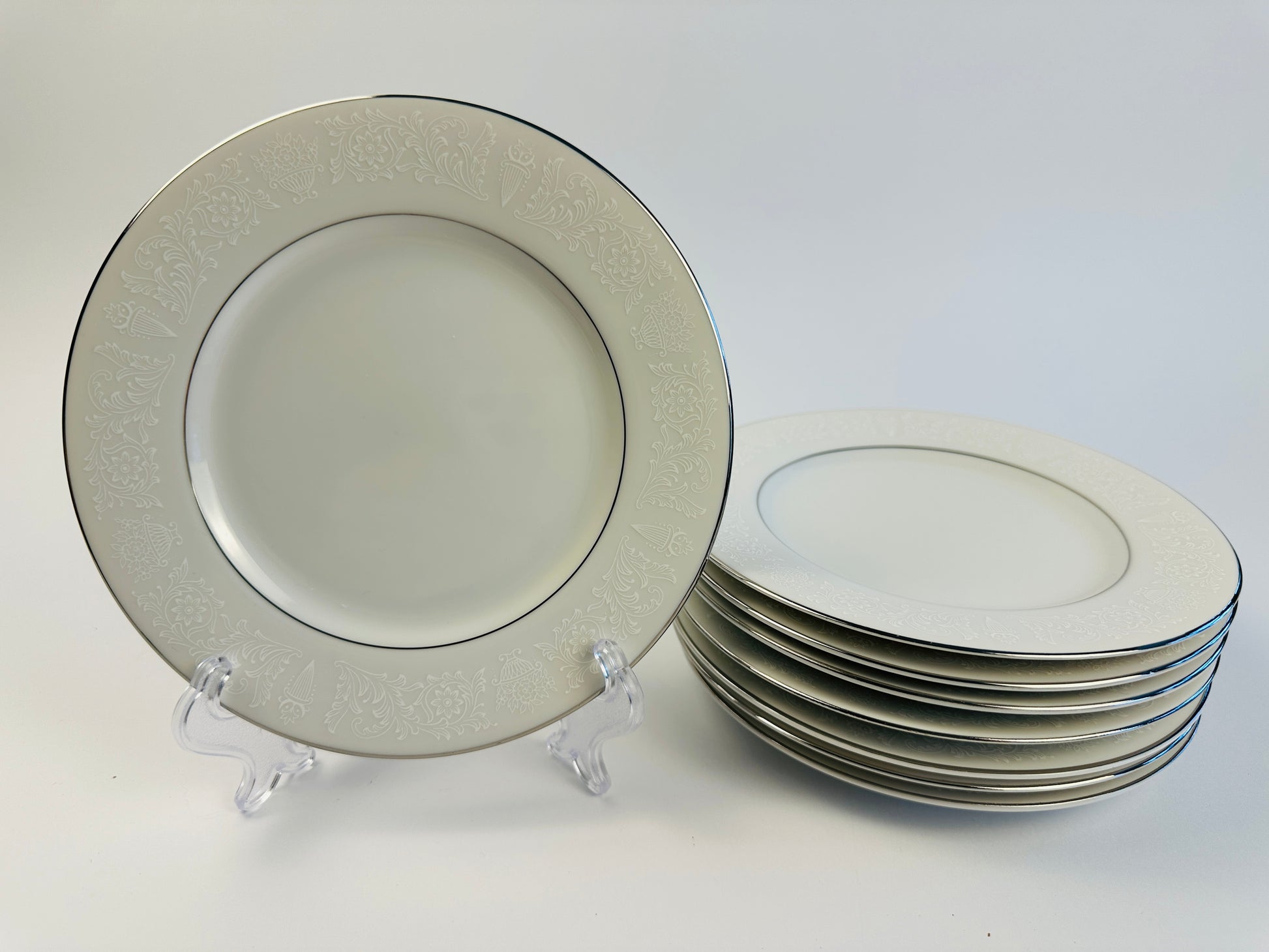 White with a silver edge and delicate tonal white “lace” rim design – truly elegant. Item sold as a set only. Additional shapes and sizes of this collection are available on our website.