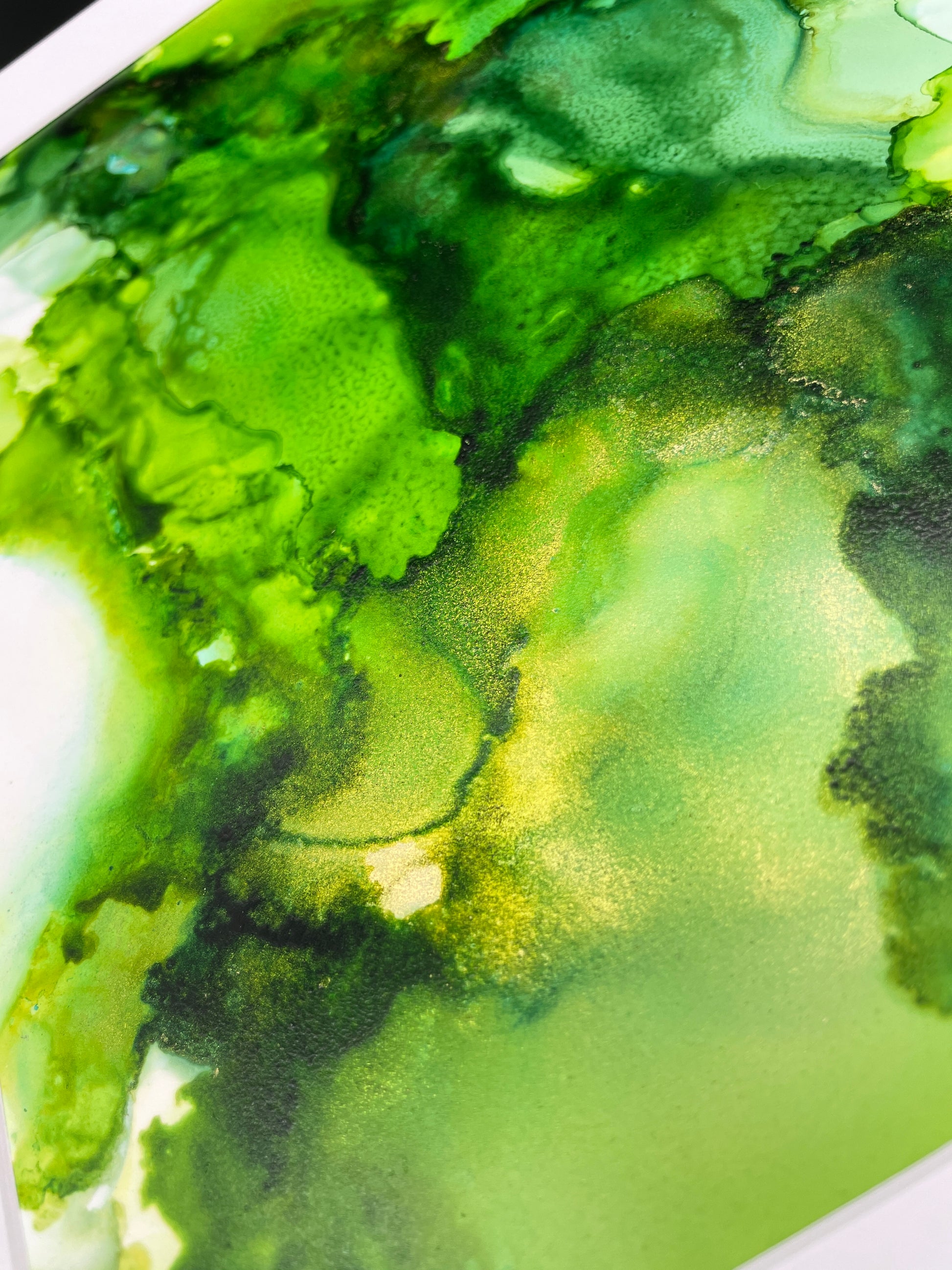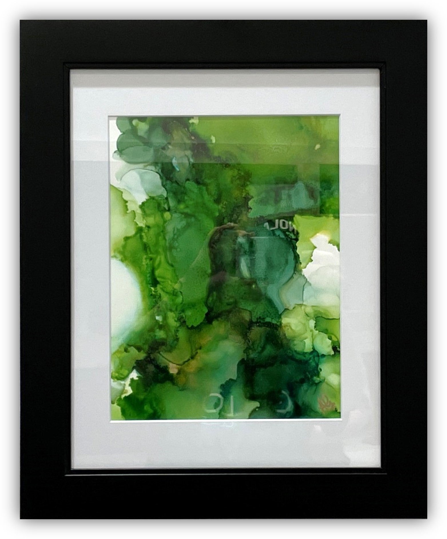 17" x 14" framed original alcohol ink art on synthetic paper. Hanging wire on back.