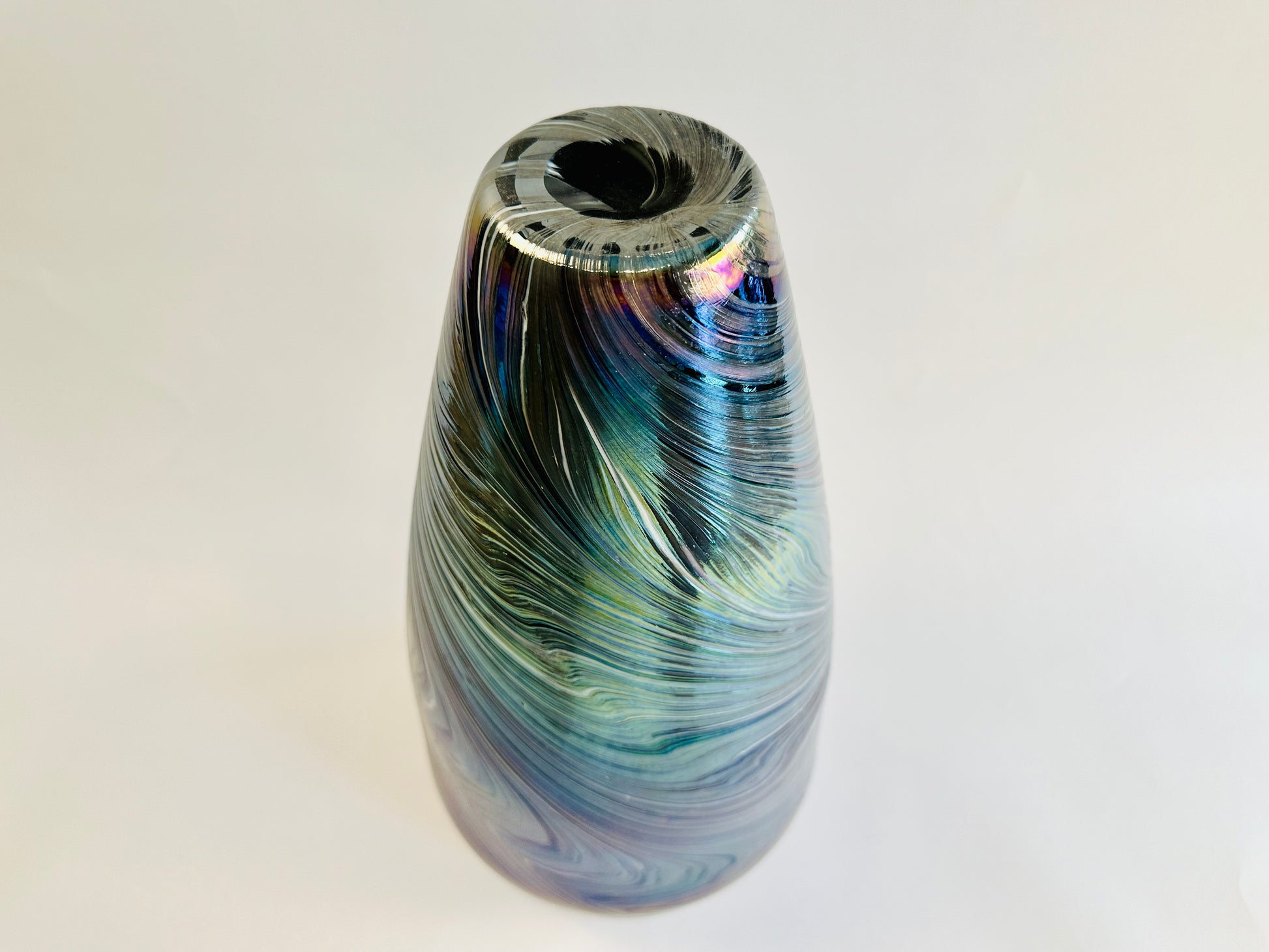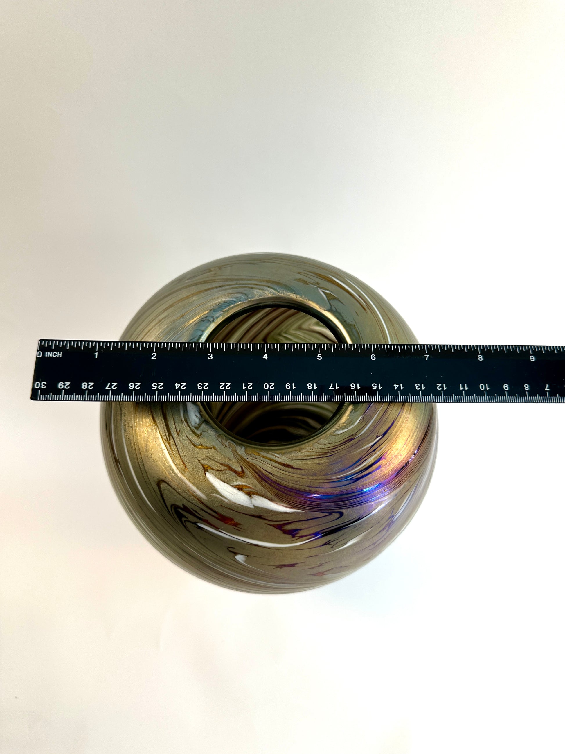 Large iridescent modern vase will showcase long stems beautifully, but is also a showstopper on its own. Dimensions shown are part of the product description.