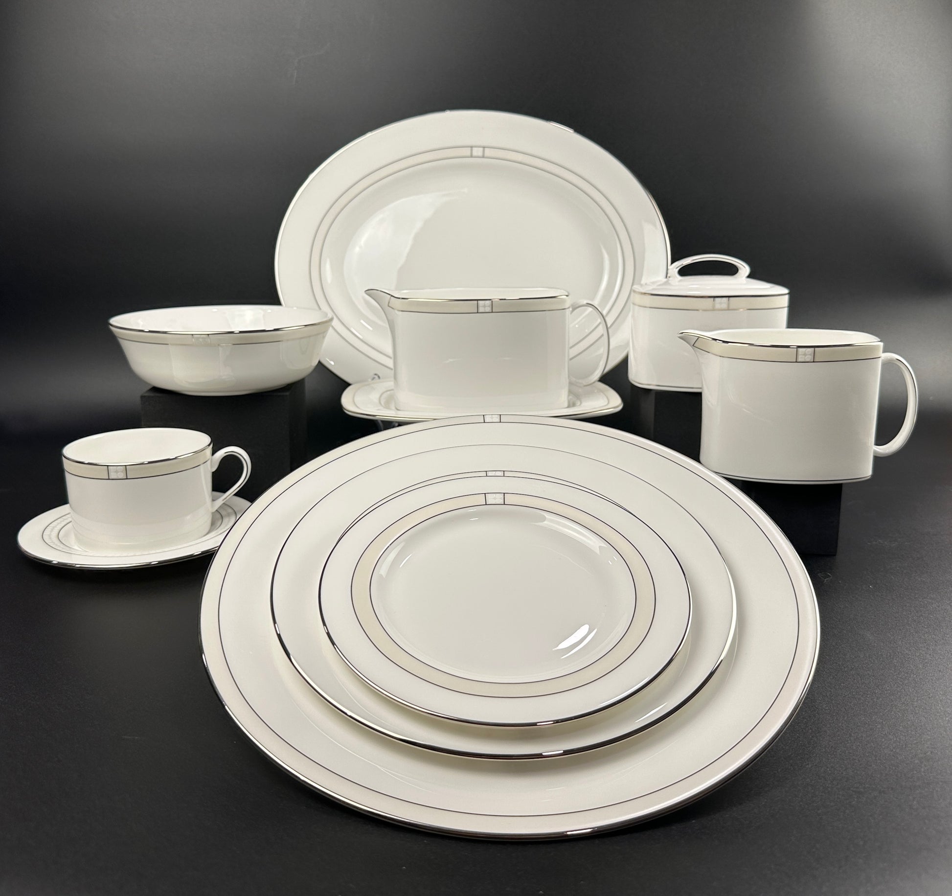 Kate Spade by Lenox “Noel Alabaster” china set for 8. This elegant modern design set includes 8 dinner plates, 8 salad plates, 8 bread plates, 8 multi-use bowls, 8 cups/saucers, platter, gravy boat with underplate, and sugar/creamer. Sold only as a set.