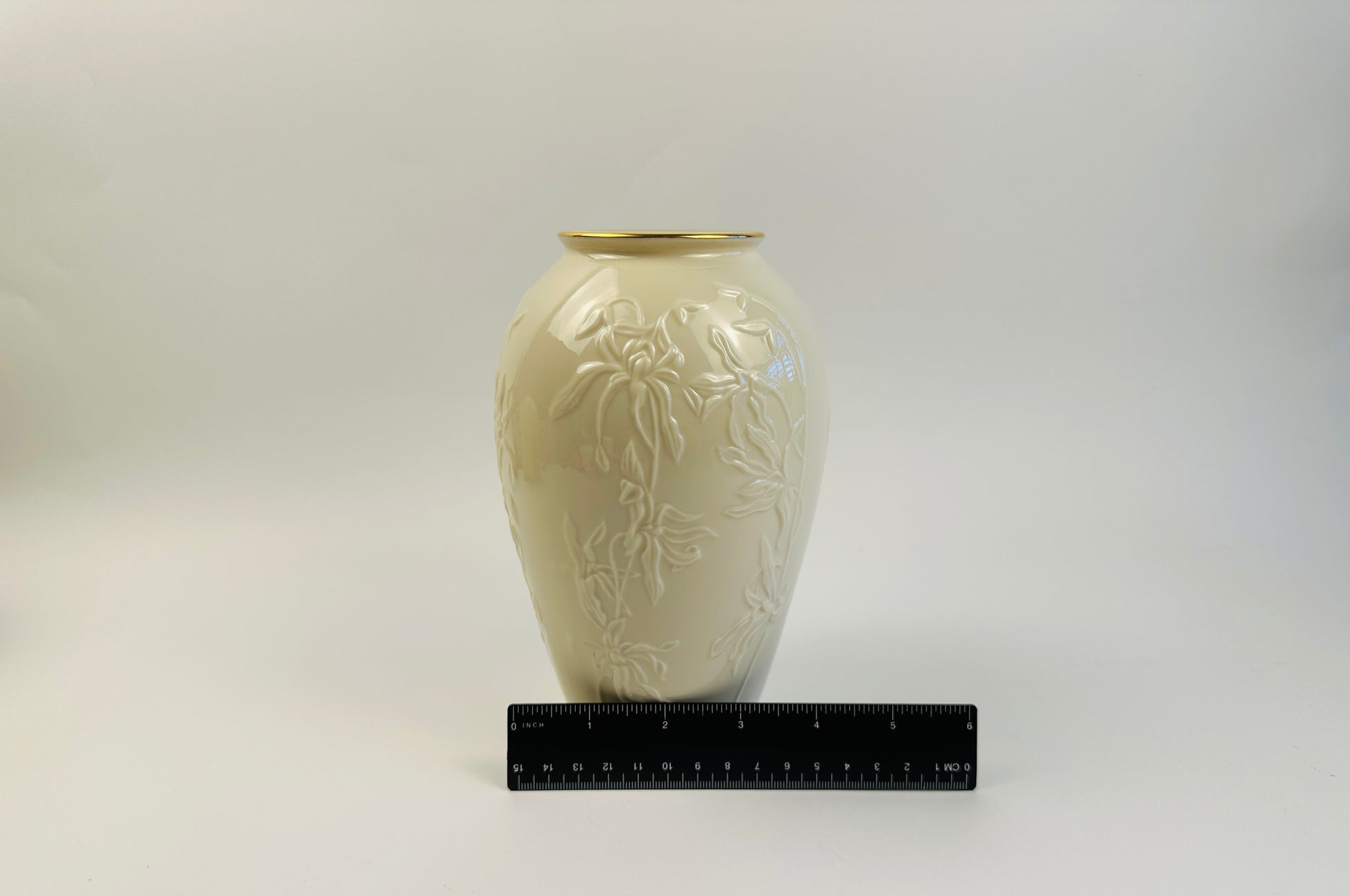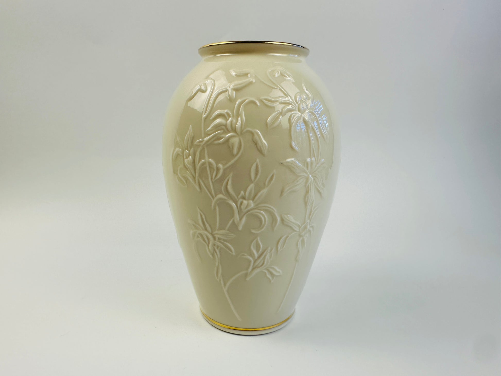 Stunning iris embossed design on a Lenox cream vase in the perfect, classic form. As an alternative to expensive florist flowers in mass-produced, throw-away vases, select a few favorite blooms for a beautiful vase as a memorable and reusable gift.