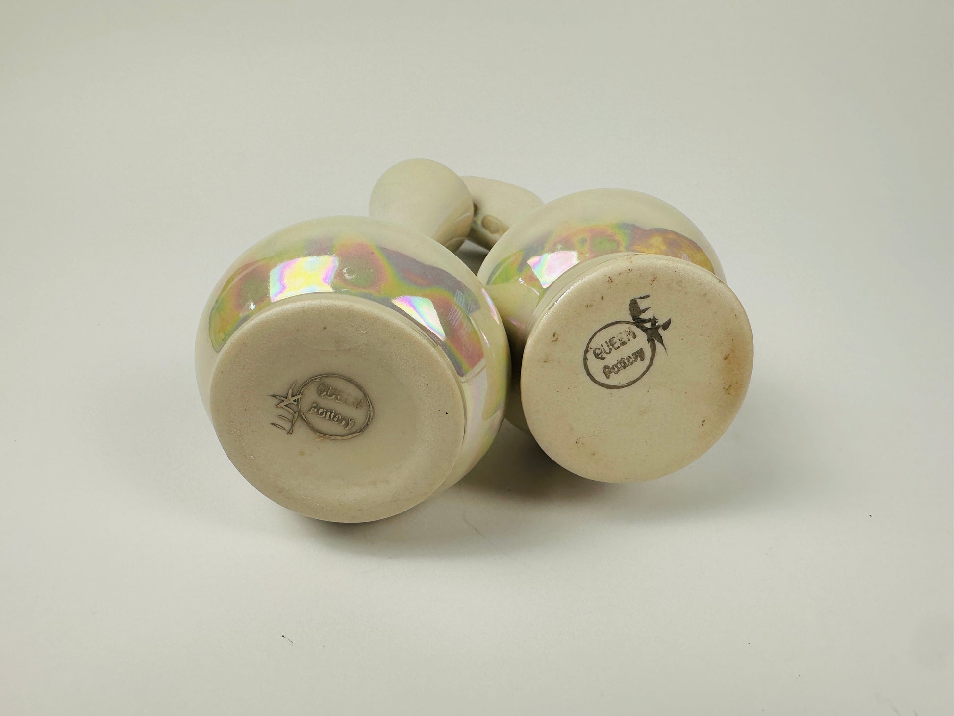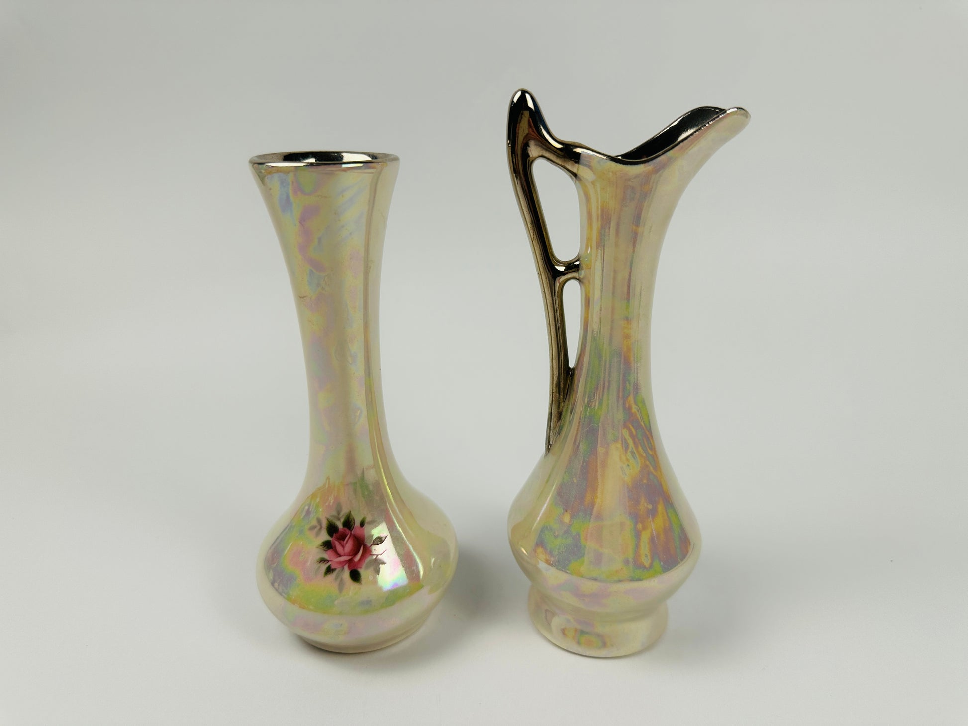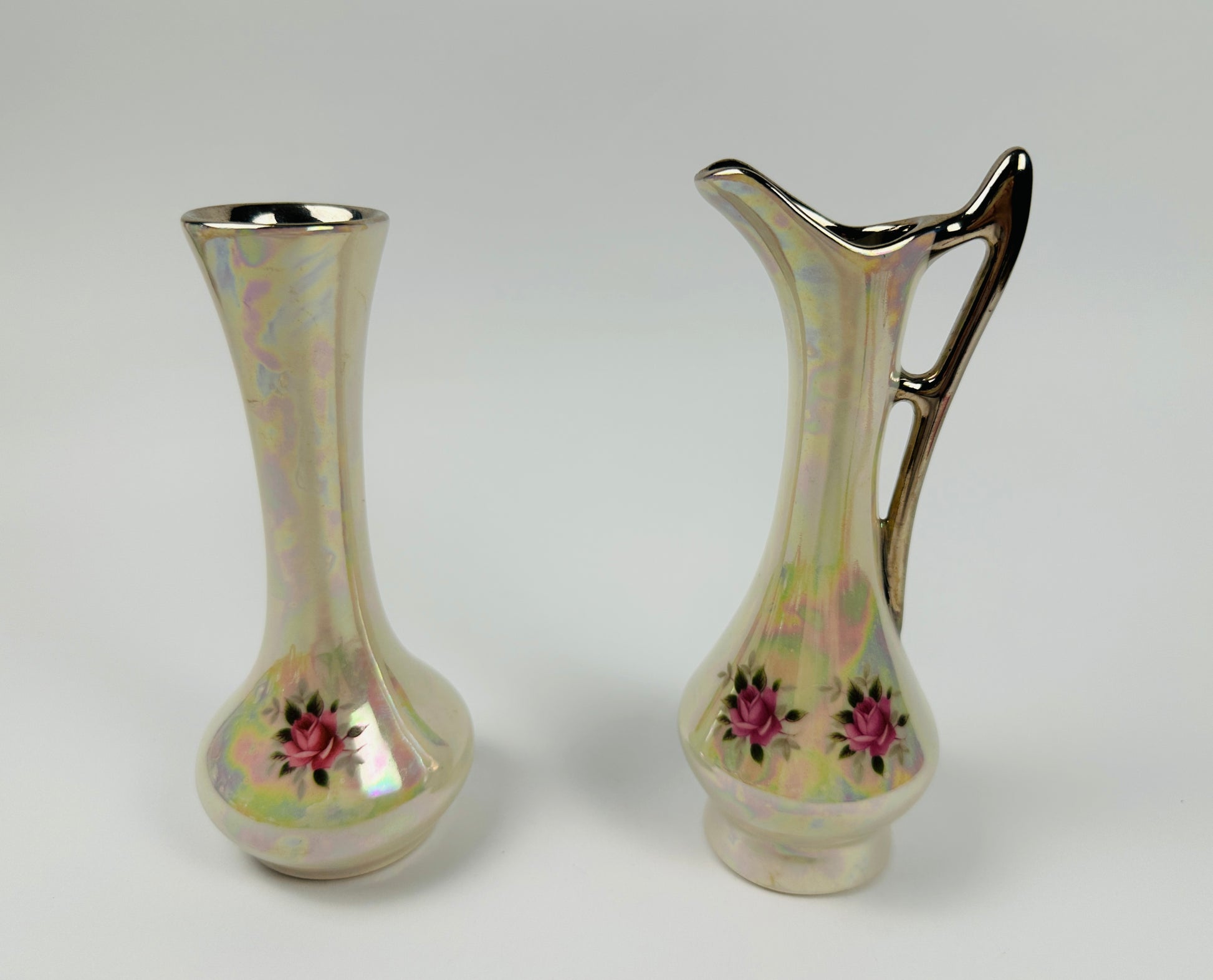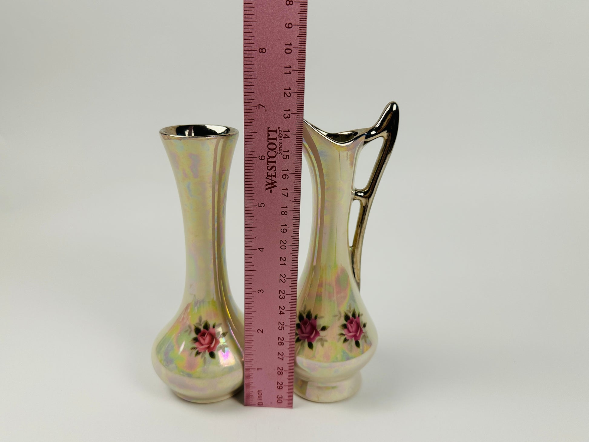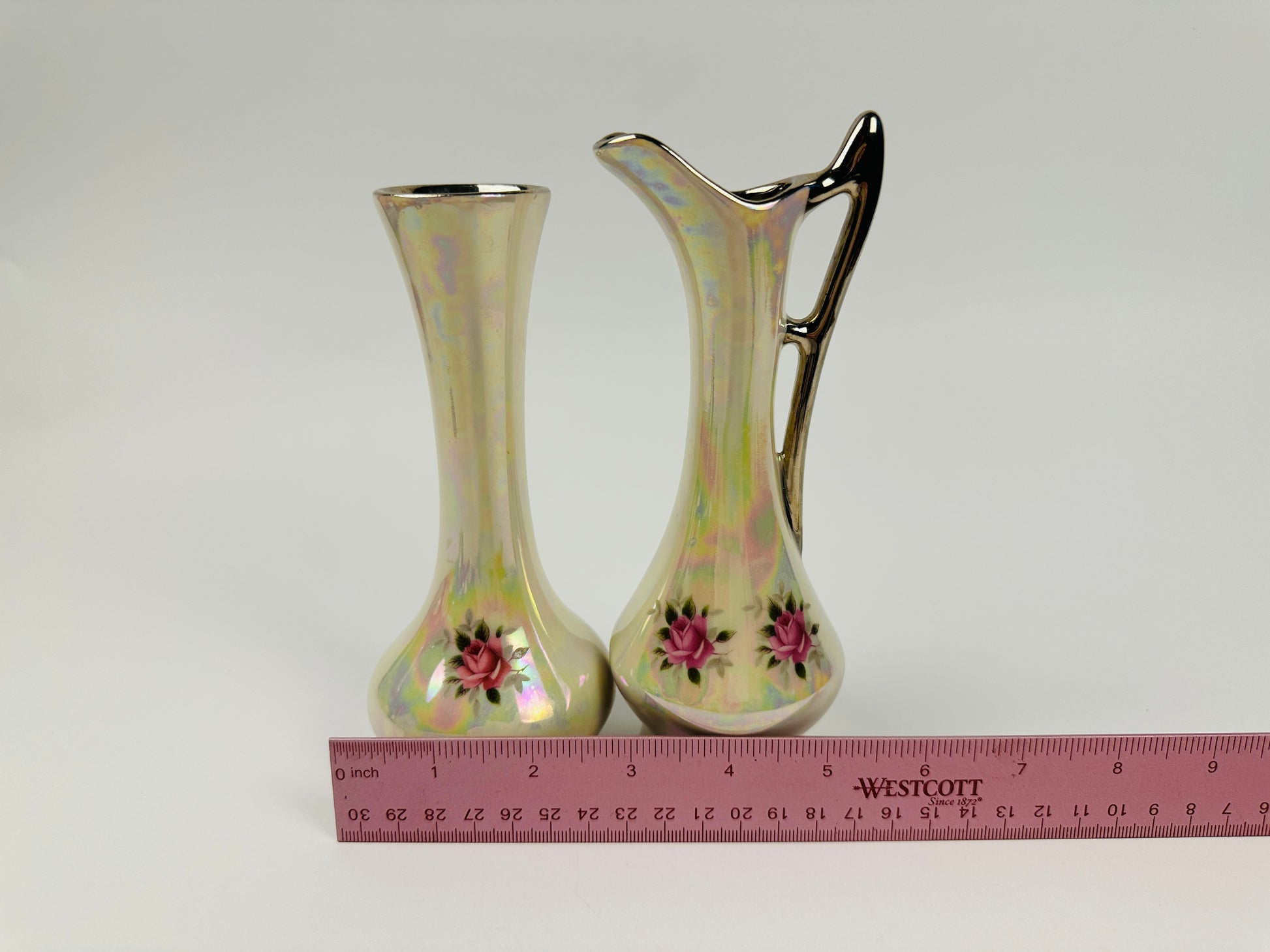 Rose accents on an iridescent bud vase duo in a classic bud and ewer-shape. These vases are intended to be a decorative accessory only.