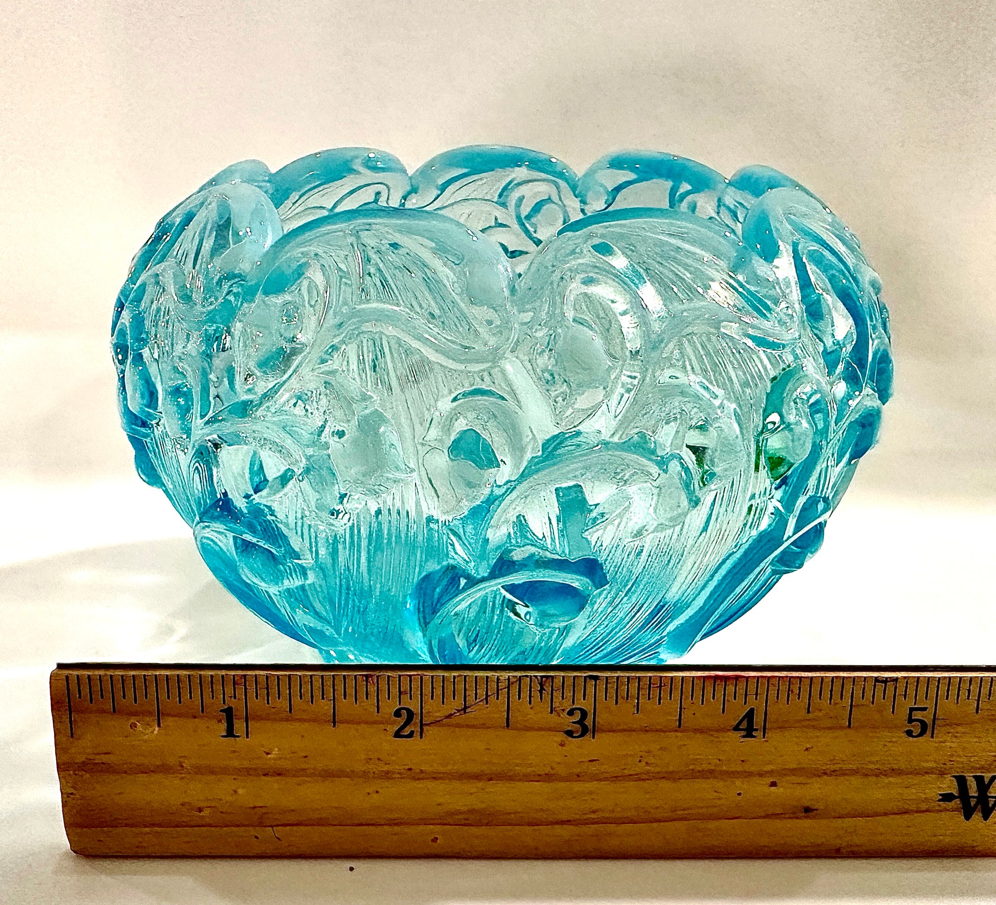 In a beautiful turquoise blue-aqua color with a milky rim and refined texture, this rose bowl vase is a visual delight. All BHDLV product offerings are previously owned. Condition is good condition unless otherwise stated. Every BHDLV website sale generates a donation to a local nonprofit animal rescue organization - thank you!