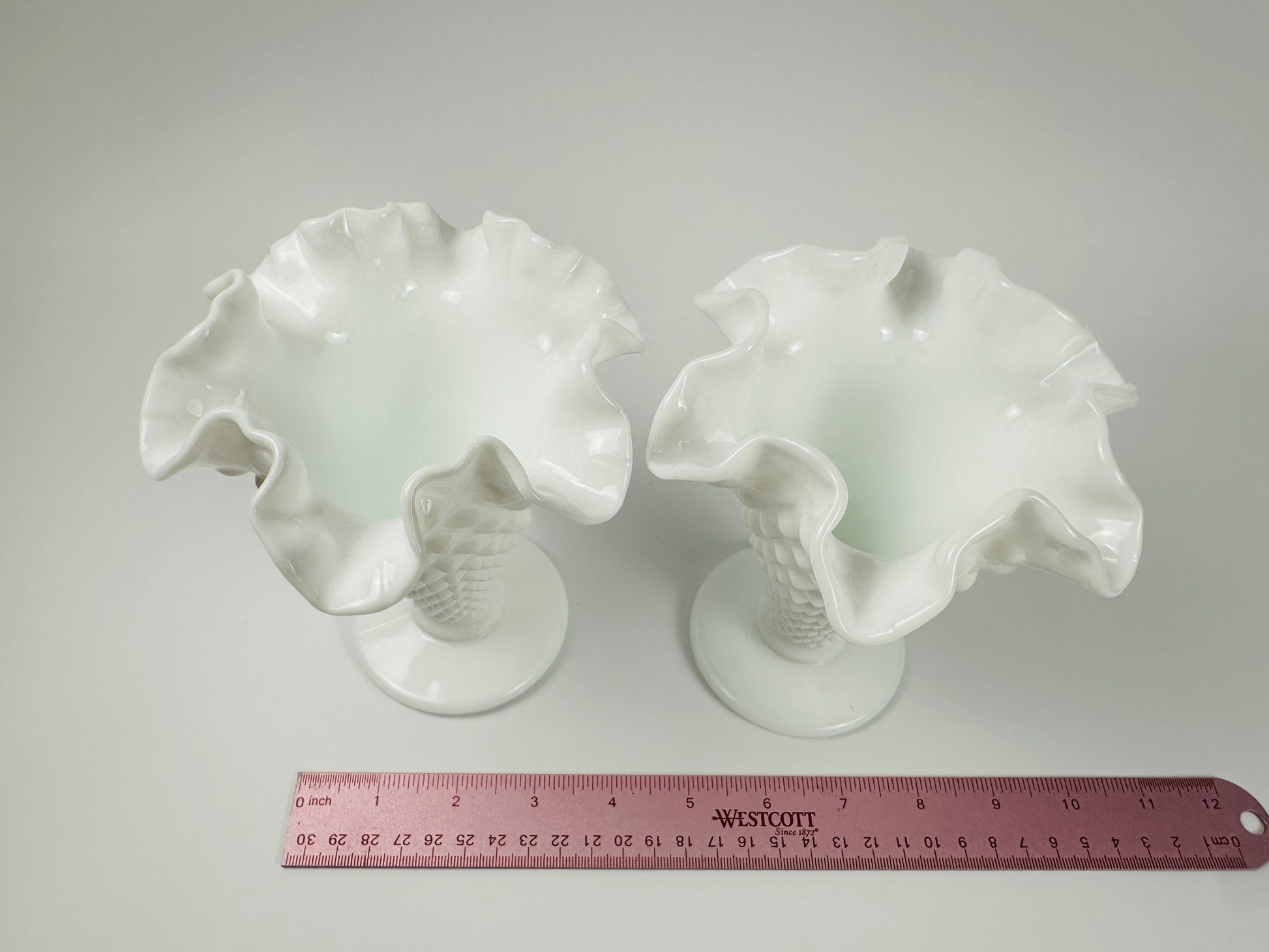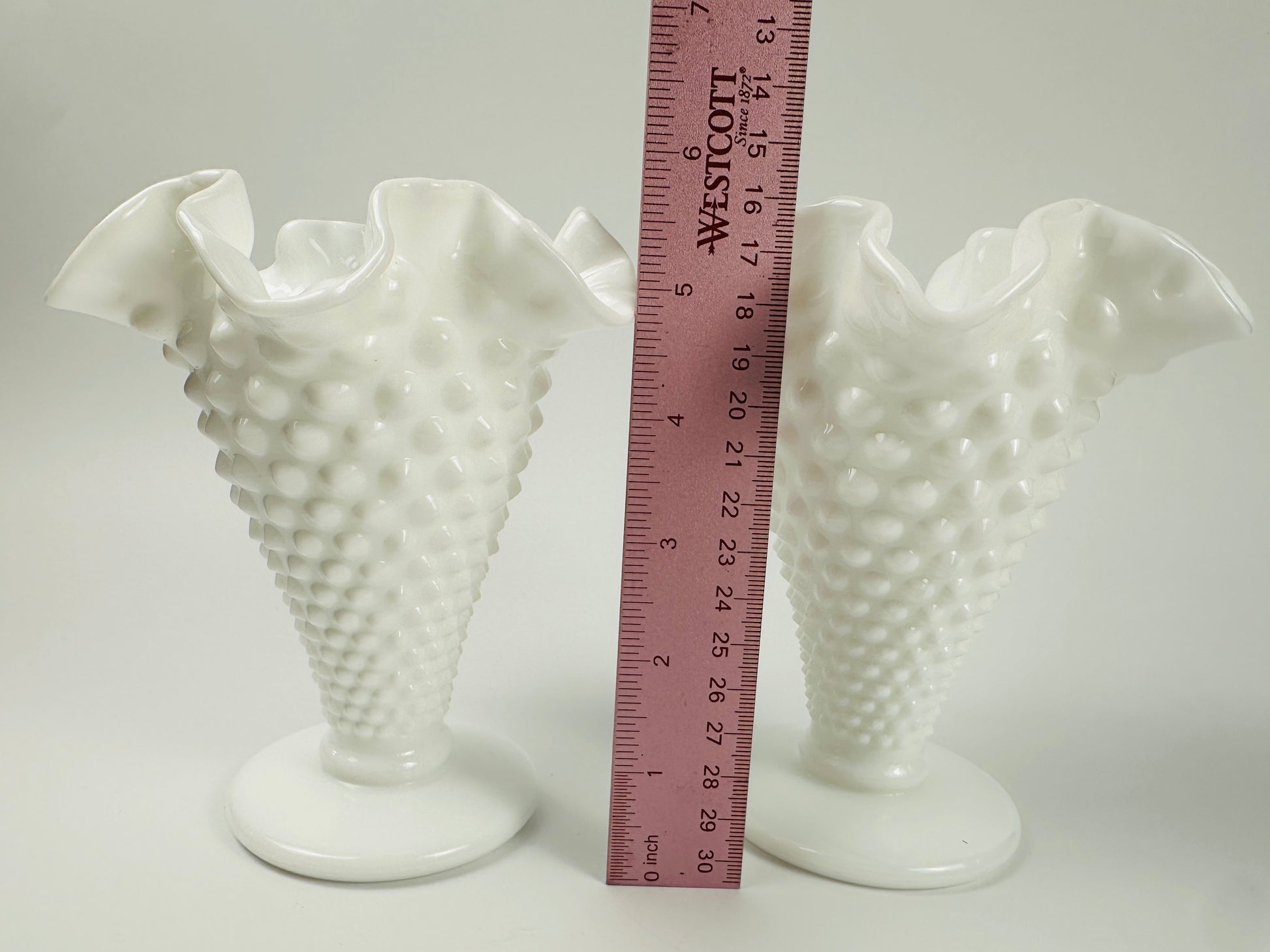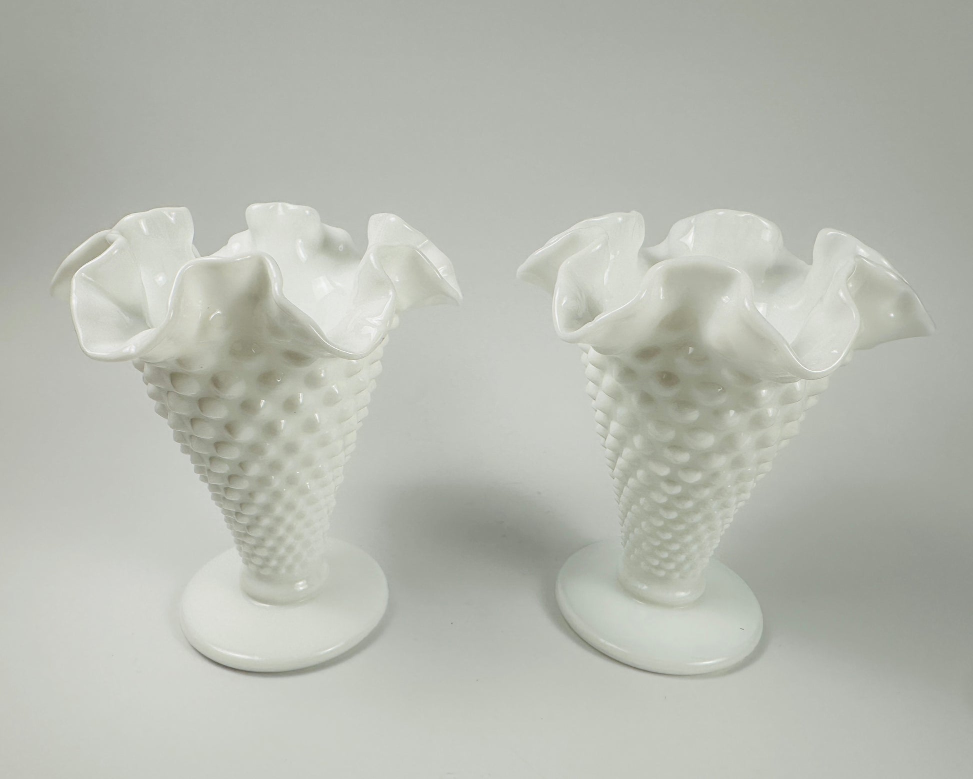 This pair of white hobnail ruffle-edge vases are classic and cheerful vintage pieces. As an alternative to expensive florist flowers in mass-produced, throw-away vases, select a few favorite blooms for a beautiful vase as a memorable and reusable gift.